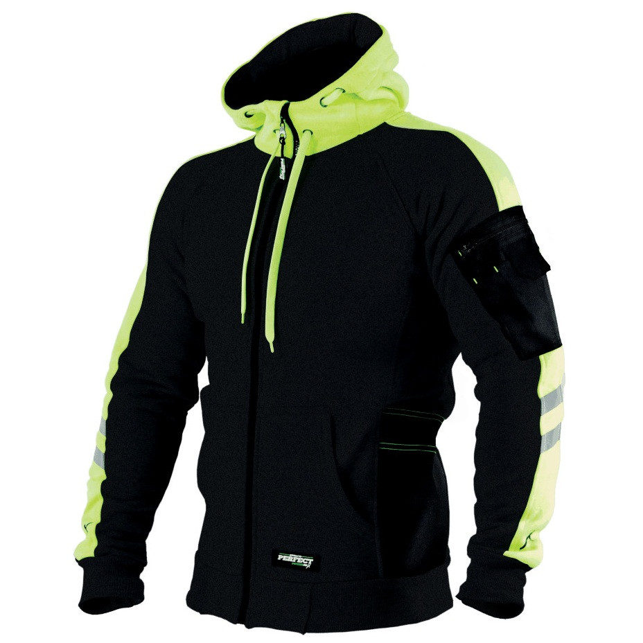 A világos, kontrasztos betétek – elsősorban a vállrészen, az ujjakon és a kapucnin – nemcsak stílusos megjelenést biztosítanak, hanem növelik a láthatóságot is, így a pulóver ideális választás lehet kültéri vagy gyengén megvilágított munkakörnyezetekhez. A karon elhelyezett praktikus zseb extra tárolási lehetőséget nyújt kisebb szerszámok, írószerek vagy személyes tárgyak számára, amelyeknek mindig kéznél kell lenniük. A cipzáras kialakítás gyors fel- és levételt tesz lehetővé, míg a megerősített varrások és a strapabíró anyag hosszú élettartamot garantálnak még intenzív használat mellett is.