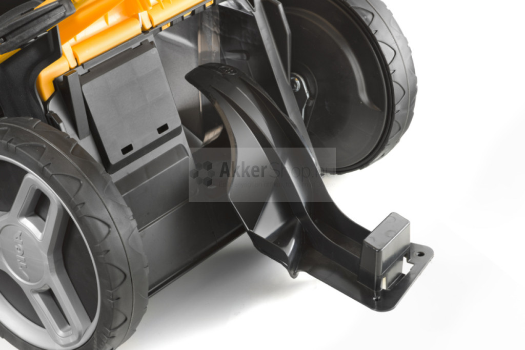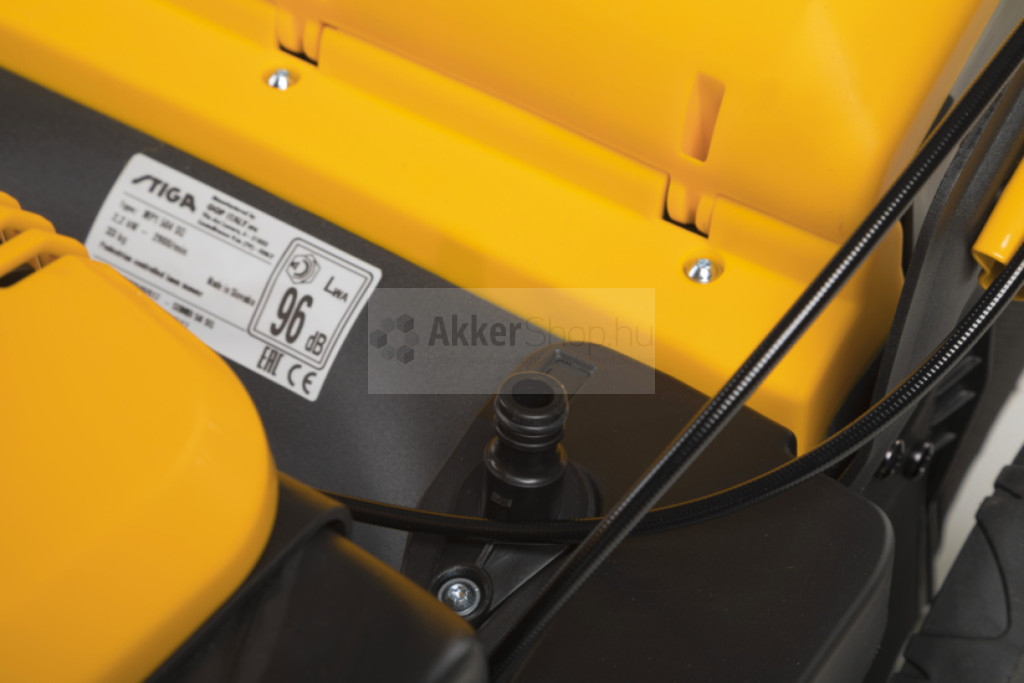 A fűnyíró galvanizált acél váza tartósságot és hosszú élettartamot biztosít, míg a golyóscsapágyazott, 200/280 mm-es kerekek könnyű manőverezhetőséget tesznek lehetővé. Az ergonomikus, állítható és összecsukható fogantyú kényelmes használatot biztosít, és helytakarékos tárolást tesz lehetővé. A beépített mosó csatlakozás révén a vágóasztal tisztítása egyszerűen elvégezhető, hozzájárulva a gép hosszú távú megbízhatóságához.