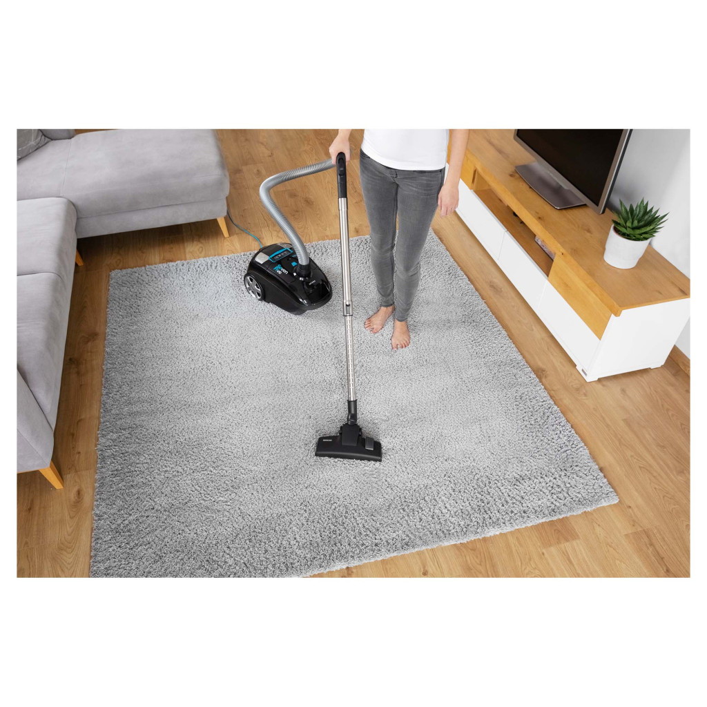 A teleszkópos fémcső és a 10 méteres hatótávolság kényelmes mozgást tesz lehetővé, így nagyobb területeket is megszakítás nélkül takaríthat. A lágyított kerekek óvják a padlót a karcolásoktól, miközben a készülék stabilan és könnyedén gördül. A 75 dB zajszint kellemesebb használatot biztosít, így a takarítás kevésbé zavaró a háztartás többi tagja számára.